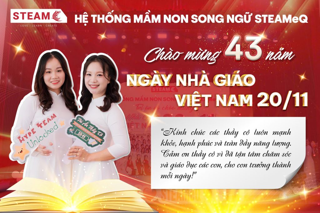 Hệ thống Mầm non Song ngữ STEAMeQ xin gửi lời tri ân trân trọng nhất đến tất cả các thầy cô giáo trên khắp cả nước, và đặc biệt là đội ngũ giáo viên STEAMeQ – những người đã không ngừng nỗ lực, sáng tạo và đặt tình yêu thương lên đầu để chăm sóc và giáo dục trẻ.